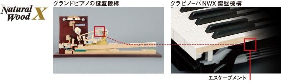 グランドピアノのエスケープメント機構は、打鍵時にハンマーが弦から速やかに離れて、弦の振動を止めないようにする仕組みです。この機構により、弱い力で鍵盤を押すとわずかな手ごたえが生じます。クラビノーバでは、よりリアルなグランドピアノのタッチの再現のために、「NWX鍵盤」にエスケープメントを採用しています。
