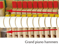 また、ストロークの最後に発生するエスケープメントの感触を再現する機構を、グランドピアノのようにハンマーを押し上げる機構の中に組み込みました。これにより、本物のエスケープメント機構特有の抜ける感触とその動作に続くストップ時の感触を、一式で再現しています。
