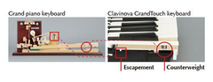 グランドピアノのエスケープメント機構は、打鍵時にハンマーが弦から速やかに離れて、弦の振動を止めないようにする仕組みです。この機構により、弱い力で鍵盤を押すとわずかな手ごたえが生じます。クラビノーバでは、よりリアルなグランドピアノのタッチの再現のために、全ての鍵盤にエスケープメントを採用しています。
