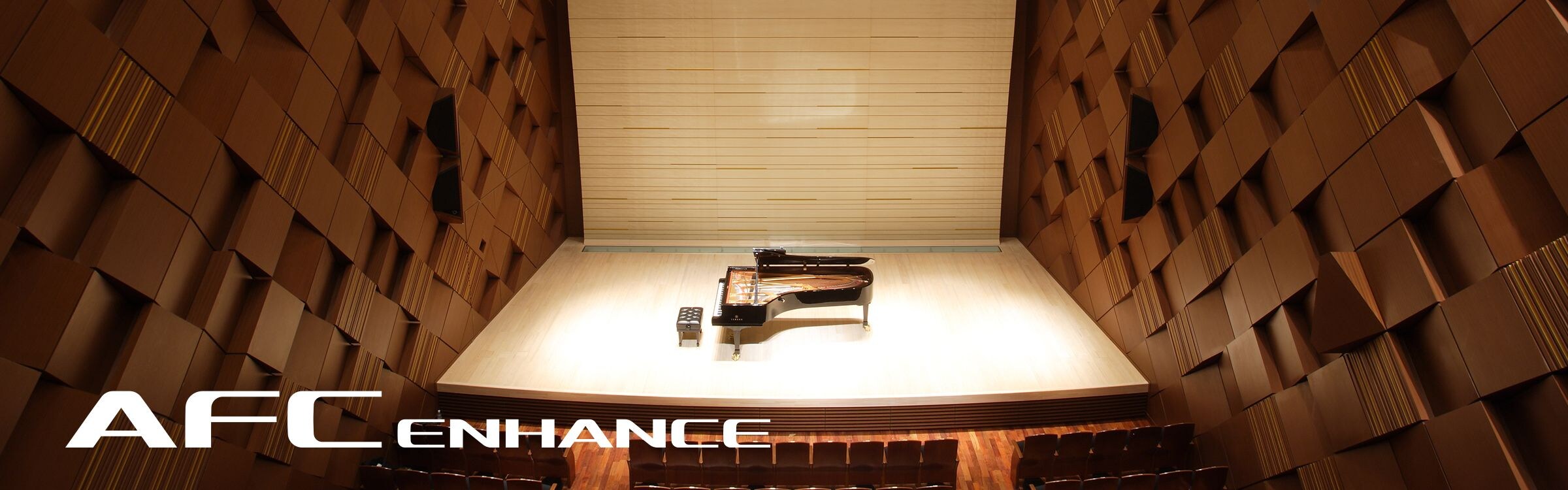 『AFC Enhance』は電気音響・信号処理技術を用いて、響きの少ない空間に、その空間固有の音響特性を元に、用途に適した響きを付加します。クラシック音楽の生演奏の音を自然かつ豊かに響かせられるほか、講演会・スピーチや演劇など、用途が多岐に渡る空間を各々に適した響きに変化させることができます。これにより、建築音響特性を活かし、そのひとつの空間を多様な演目で活用することができます。
