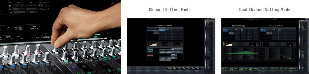 Nuage Faderの16チャンネル全てにタッチセンスのマルチファンクションノブを2基搭載。 METER、PRE、ROUTING、PAN、SENDS、CUEなど操作したい項目を瞬時に呼び出し、操作することが可能です。また、操作したいチャンネルのeボタンを押せばChannel Setting Modeになり、そのチャンネルのパラメーターを32基全てのマルチファンクションノブを使って集中的に操作することができます。Dual Channel Setting Modeでは任意の2チャンネルのパラメーター16基ずつのノブで同時に操作できます。また必要に応じ、ノブを押し回すことで二段階の緻密さでパラメーターのレベルを調整できます。更にはノブにアサインしたパラメーターをフェーダーで操作することもできるなど、状況と好みに応じてフレキシブルな使い方ができます。