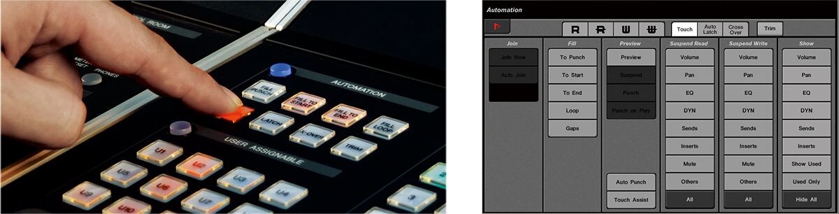 Nuageでは、全てのオートメーション設定を一括管理できるNuendo/Cubaseの「オートメーションパネル」をそのまま再現、 Nuage Masterのマルチファンクションディスプレイからフルアクセスが可能です。 更にオートメーションのパンチアウト時のモード(Touch、Auto-Latch、Cross-Over)や、パンチアウト後の挙動を指定するFill オプション(Fill to Punch、Fill to Start、 Fill to End)などもNuage上から切り替え可能です。もちろんオートメーションの読み込み( Read )ボタンや書き込み(Write)ボタンは各チャンネルストリップに装備、快適なオートメーション作業の為の万全の状態が整っています。