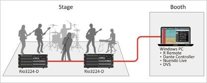 これにより、I/OラックとNuendo Live等のDAWソフトウェアがイントールされたPCのみでのライブレコーディングシステムや、02R96や01V96iといったHAリモートに対応していないコンソールとI/Oラックと組み合わせること(コンソールにはDante-MY16-AUDもしくはDante-MY16-AUD2の装着が必要です)、Danteで構築されたフルパッチ可能な設備内インフラをコンソールと切り離して運用する、というような可搬性や拡張性に優れたシステムが実現します。