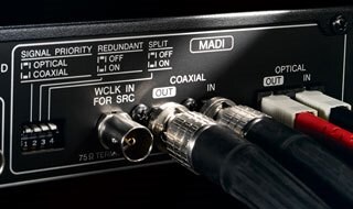 Dante接続だけでなくMADI接続も二重化が行えます。オプティカルと同軸の2種類のケーブルを接続して、優先入力の信号が途切れてももう一方の接続に自動的に切り替わります。