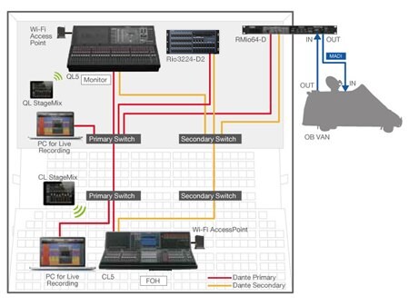 CL /QLシリーズをFOH/STAGEに配したDanteネットワークシステムに、RMio64-Dを組合せたライブアプリケーション例。RMio64-DでDante信号をMADI信号に変換し、MADI対応機器を搭載した音声中継車などに送出するなどの用途に対応できます。RMio64-DのSRC機能を用いることで、ライブシステムと音声中継車同士のワードクロック同期の問題からも解放されます。
