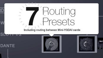 フォーマットコンバーターやルーターとしてRSio64-Dをより便利に、よりシンプルにご使用いただけるよう、Mini-YGDAIカード間のルーティングを含む汎用性の高い7種のルーティングパターンを本体にプリセットしています。フロントパネルのロータリースイッチを設定するだけで、Dante/Mini-YGDAIカードの1対1接続やMini-YGDAIカード/Mini-YGDAIカードの分岐など、様々なユースケースに対応できます。また、ユーザーが編集できるユーザーパターンも1種用意されています。