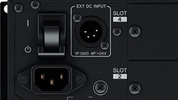 本体にはAC IN端子に加え、XLR-4-32タイプのEXT DC INPUT端子を装備しました。本端子から外部電源(+24V)を供給することにより、RSio64-Dの内部電源をバックアップすることが可能です。またAC IN端子もラッチによるロック機構(Vロック)を備えており、電源コードが意図せず外れてしまうのを防ぎます。