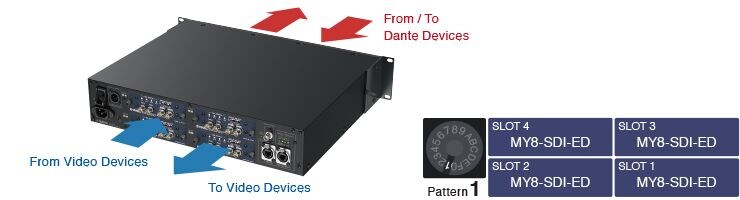 HD-SDI/SD-SDIエンベッド/ディエンベッドカード「MY8-SDI-ED」を4枚装着し、HD-SDI/SD-SDIとDante信号の相互変換を実現します。RSio64-Dは各スロットにサンプリングレートコンバーターを搭載しているため、異なるワードクロックで動作している機器が接続されてもノイズや音切れなく運用することができます。