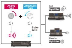1台のI/Oラックに複数のコンソールを接続した場合、各オペレーターがそれぞれアナログゲインを操作すると、意図しない形で音量が変化してしまいます。それを防ぐために、CLシリーズではゲインコンペンセーション機能を搭載。コンソールからアナログゲイン操作を行ってもデジタル段で自動的にゲインが補正され、I/Oラックから複数台のCL本体に送出される音量は一定に保たれます。