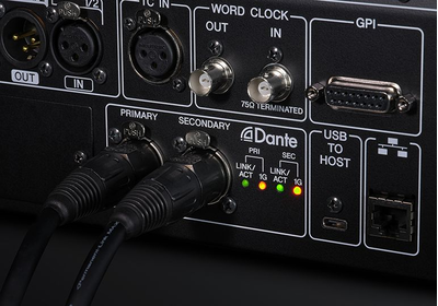 DM7シリーズは、ソフトウェア、ハードウェア、ネットワークプロトコルの組み合わせで、プロオーディオの業界標準となっているオーディオネットワークDanteインターフェースを標準で搭載し、Dante経由で144ch in/outが可能です。Danteは1本のEthernetケーブルで数百のオーディオチャンネルを伝送することができ、どの分野でもチャンネル数の上限を気にすることなく、柔軟な拡張性の高いネットワークシステムを構築することができます。デバイスマウント機能により、DM7シリーズからDante対応機器とのパッチやHAリモート、デバイスコントロールも容易に行えます。