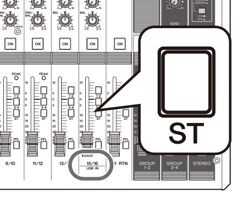 2.(MG20XU/MG16XU/MG12XU) USBに設定したステレオチャンネルと、マイクなどを接続したチャンネルの[ST]スイッチを押します。