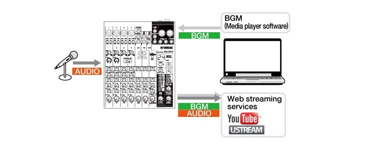 インターネット放送で使う場合は、オーディオ再生ソフトウェアからの再生音と、マイクからの音をミックスしてコンピューターに戻す設定をします。