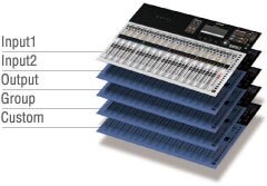 2つのINPUTバンク、1つのOUTPUTバンクに加え、GROUPバンク、CUSTOMバンクを用意。GROUPバンクは 2つのINPUTボタンを同時に押すことでアクセスでき、複数のチャンネルのレベルを1つのDCAフェーダーにより 操作することができます。またCUSTOMバンクはINPUT2とOUTPUTボタンを同時に押すことでアクセスでき、 インプットフェーダー/アウトプットフェーダー/DCAグループフェーダーを自由にアサインして使用することができます。