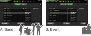 シーンメモリーはAバンクとBバンクに分かれており、それぞれのバンクには最大100、計200のシーンを保存可能。 バンクは用途によって使い分ける事ができ、例えばバンクAにはバンドタイプによって設定されたシーン、バンクBにはイベントタイプによって設定されたシーンといったように分けて運用する事ができます。
