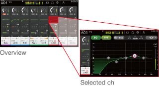 CLシリーズと同様、Overview画面とSelected Channel画面を2つの基本画面として用意。8チャンネル分 のパラメーターをまとめて表示し、アナログコンソールに近い感覚で操作できるOverview画面は、TOUCH AND TURNノブを使って、GAIN、1-knob EQ™/1-knob COMP™/GATEのスレッショルド、エフェクトの送り量、パンなどを直接操作できます。ハイライトされたボックスをもう一度タッチすると現れるSelected Channel画面では、詳細なパラメーターや情報が表示され、より細かい音作りを行うことができます。