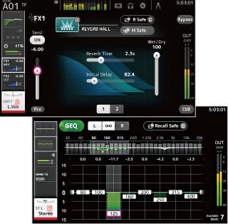 『TFシリーズ』にはチャンネル毎のプロセッサーに加え、計8基の強力なプロセッシング/エフェクトユニットを搭載。全てのユニットにライブやレコーディング現場で定番のSPXを搭載しており、リバーブやディレイはもちろん、フランジャーやコーラスといったモジュレーション系、3バンドのマルチバンドコンプレッサーなど、19プログラムを用意しています。SEND/RETURNでの使用が前提の2基のグローバルFXは、パネルのEDITキーを押すとエフェクトパラメーター画面がタッチパネル上に展開され、リバーブタイムやディレイのフィードバックなどのパラメーターを瞬時に調整することができます。残る6基のInsFXは、あらかじめステレオAUX9/10~19/20のBUSマスターにインサートされており、マルチバンドコンプレッサーを使用してインイヤーモニターへのレベル管理を行う、といったことができます。