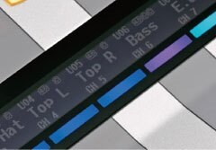 各チャンネルフェーダー上部には小型の有機ELディスプレイを装備。チャンネルネームやID、ポート名、フェーダー値だけでなく、ファンタム電源、GATE、COMPの状態も表示できます。また、チャンネルカラーと連動したカラーバーによって、スムーズな操作を視覚面でサポート。フェーダーバンクの切り替えや、シーンリコール後にチャンネルの役割が変わっても迷うことなく操作することができます。