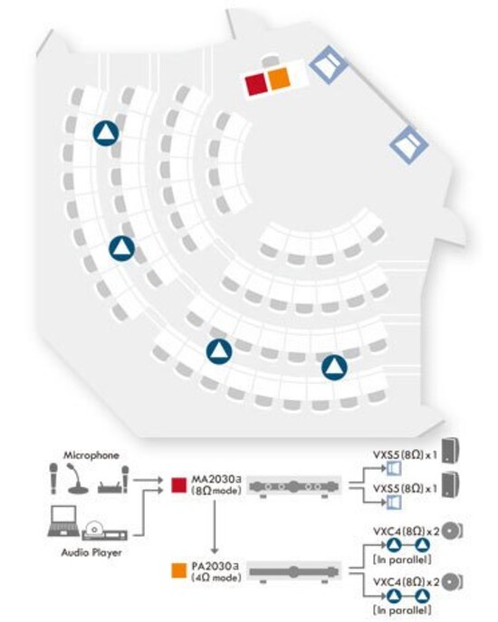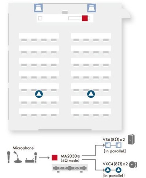 8Ωモードに設定したMA2030aと4Ωモードに設定したPA2030aに、それぞれサーフェスマウントスピーカーVXS5 (8Ω)を2台と、シーリングスピーカーVXC4 (8Ω) を4台接続しています。MA2030aには複数のマイクが接続でき、部屋内のアウトプットボリュームはアンプのフロント側にあるボリュームノブで簡単に調整できます。