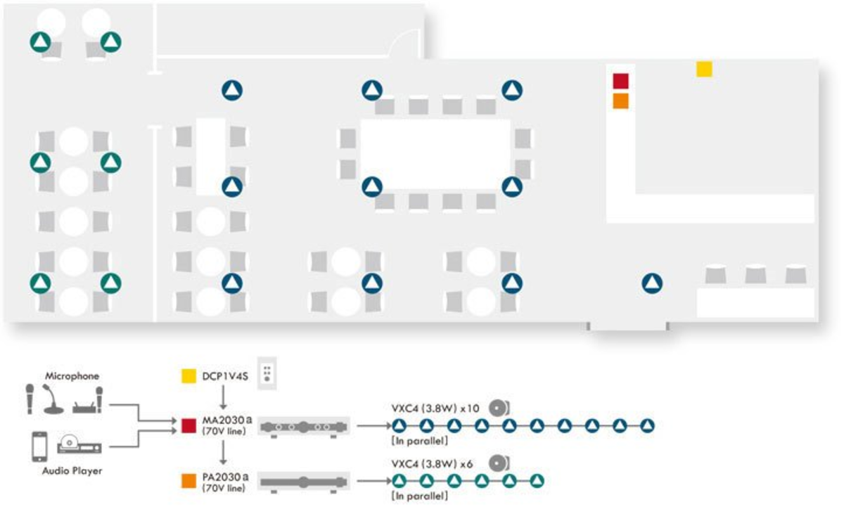 この図は、カフェ、バー、レストランを想定したシステムの一例です。MA2030aとPA2030aはどちらも70系に設定し、タップの設定を3.8WにしたシーリングスピーカーVXC4を2つのゾーンに分けて16台接続しています。MA2030aとPA2030aはゾーン毎のボリュームを独立に制御し、DCP1V4S-USはシステム全体のアウトプットボリュームを独立に制御します。MA2030aはマイクとオーディオプレーヤーを同時に接続できるので、このシステムのみで、昼間はBGMを再生し、夜間は小さなイベントの開催にも対応可能です。