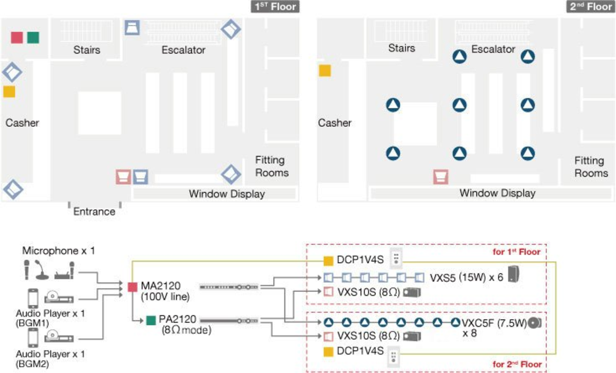 こちらの図は、2フロアのアパレル店舗を想定したシステムの一例です。MA2120を100系に設定し、1F用にサーフェスマウントスピーカーVXS5を6台、および2F用にシーリングスピーカーVXC5F を8台接続しています。フロアごとに異なる音源を再生し、音量を個別に制御することができます。PA2120には各フロア用にサブウーファーVXS10Sを1台ずつ接続しています。DCP1V4S-USにより、フロア毎の音量や店内アナウンス用のマイクのオン・オフをそれぞれ遠隔制御することができます。