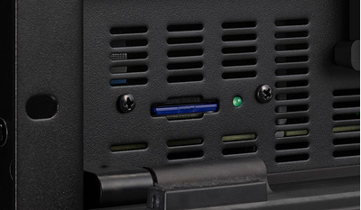 開閉式のフロントパネル内側にSDメモリーカードスロットを1基備えています。MP3やWAVファイルが再生でき、再生/停止は任意の外部制御や内部動作と連動できるため、アナウンスやブザー、チャイムの再生用途に適します。
