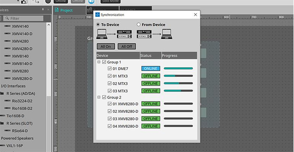 『ProVisionaire Design』で作成したコンフィグレーションを、プロセッサー本体に流し込み、設定を同期する機能です。シンクロナイゼーション機能を実行すると、『ProVisionaire Design』とプロセッサー本体は「オンライン状態」となり、『ProVisionaire Design』からプロセッサーのパラメーターをリアルタイムに操作できます。
