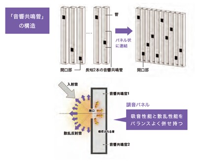 音響共鳴管を、パネル状に連結した独自の構造です。音響共鳴管にはそれぞれ違った位置に開口が設けられており、この開口部の上下で長さが異なるため、1本につき2つの周波数で共鳴する仕組みです。