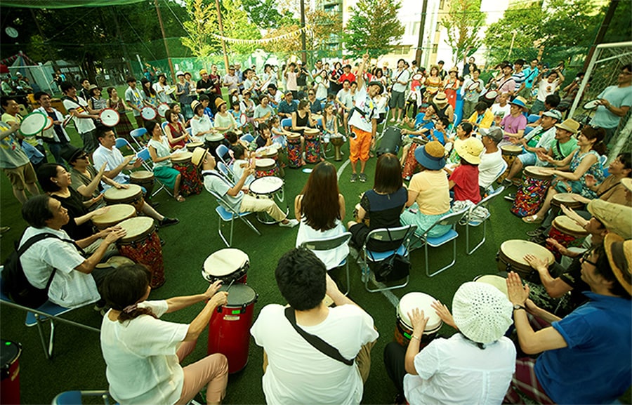 参加者が輪になって即興的に作り上げる打楽器・パーカッションのアンサンブル。