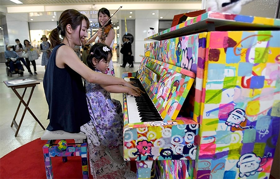 ヤマハのストリートピアノプロジェクト。駅や空港、商業施設などのオープンスペースにカラフルにペイントされたピアノを期間限定で設置し、誰でも自由に演奏できる機会を提供します。