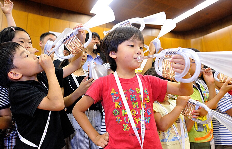 身近な材料を使って、ギターやトランペットなどの楽器をつくるワークショップ。完成した楽器を使って合奏することで、楽器の楽しさや楽器の音の出る仕組みを体験できます。