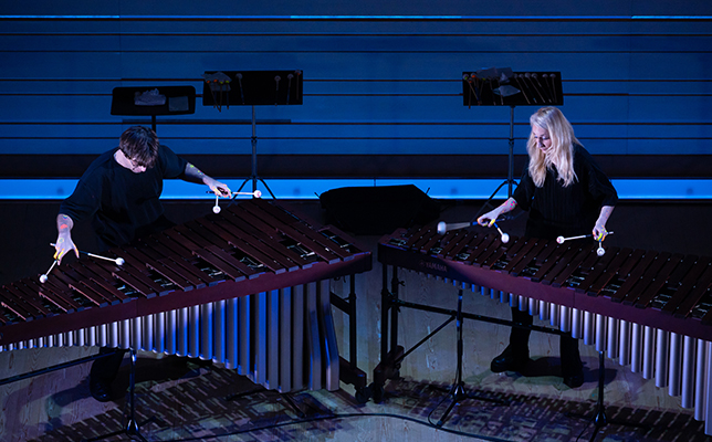 ミニマル風でもあるが、風の音や電子的なノイズ音も交えながら、曲は様々な表情を見せて進行する。レゲエのダブのようなマリンバの打音のエコーも聴こえる。そして途中からディスコビートが始まった。楽音と噪音、ミニマルとディスコが交錯し、音の相乗効果(Sonic Synergy)を作り上げていく。ポリリズムから浮かび上がる劇的な旋律が美しい。ジャンルを超えた新しい調性音楽を実感させる。照明を駆使した没入型のステージは新たなコンサート体験も提示した。マリンバの魔術師2人が開く21世紀音楽に今後も期待したい。