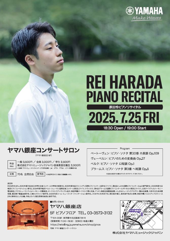 | 料金 | : | 一般 3,500円 会員 3,000円 学生 2,500円 ヤマハミュージック 音楽教室在籍生 2,000円 ※会員:ヤマハミュージックメンバーズ(有料会員)、jet、JPTA、PTNA、ピアノ指導者の会 |