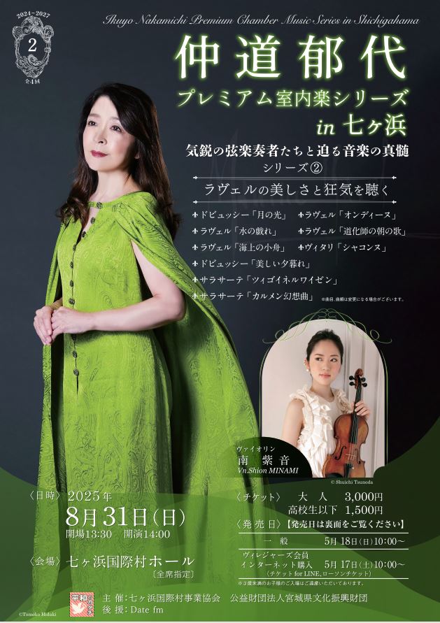 仲道郁代プレミアム室内楽シリーズ in 七ヶ浜 気鋭の弦楽奏者たちと迫る音楽の真髄 シリーズ② ラヴェルの美しさと狂気を聴く