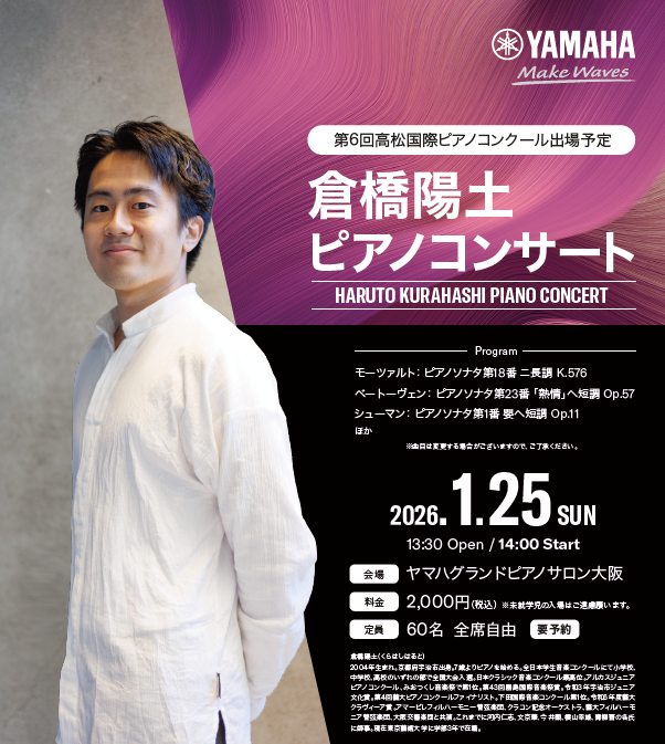 | 会場 | : | ヤマハグランドピアノサロン大阪 [大阪府] |