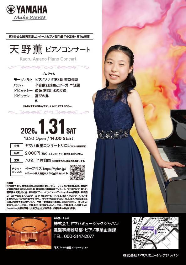 2025年、世界各国の実力者が出場する「第9回仙台国際音楽コンクール」ピアノ部門において最年少出場にして第3位入賞を果たした天野薫さん。研ぎ澄まされた感性と深い楽曲理解が生み出すその音色は、聴く者の心を揺さぶる力がありました。輝きに満ちた旋律をコンサートでぜひご堪能ください。