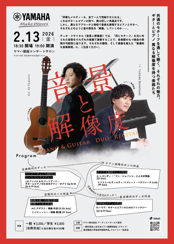 この企画には、私たちの楽器の魅力を伝えたいという想いが詰まっています。このプログラムを通して、聴いてくださるお客様一人一人へギターとピアノ、そして音楽そのものへの新たな魅力を感じていただけるような時間をお届けできたらとても嬉しく思います。皆様のご来場を心よりお待ちしております。(黒崎拓海)