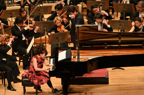 佐渡の指揮で、弦楽器がふっくらとしたアンサンブルを聴かせていく。大きな波がゆったりと寄せ引いていくようなダイナミックな演奏。そこに上原がアクセントを生む。佐渡が紹介したとおり1音1音が美しい。譜面を尊重しながら、あるときはきらめく波光のように、あるときはゆらめくさざなみのように、景色を見せてくれる。ジャズを演奏しているときとは趣を異にする、幼いころからクラシックも演奏してきた上原の音の表情を聴かせてくれる。
