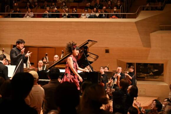 演奏中に声を発し、ピアノのボディの内部の弦をはじき、立ち上がって肘で弾き、会場全体に笑顔をふりまく上原。即興の極みと言っていいだろう。途中でガーシュウィンの代表曲の1つ、「ラプソディ・イン・ブルー」のフレーズも盛り込む。第1ヴァイオリンも、第2ヴァイオリンも、チェロも、ビオラも、管楽器も、新日本フィルのメンバーは誰もが、それぞれの定位置で驚愕しながらも顔をほころばせている。ピアノまでが楽しそうに歌っている。クラシック音楽の殿堂の1つ、席数約2000のサントリーホールがまるでジャズクラブかライヴスポットになったみたいだ。