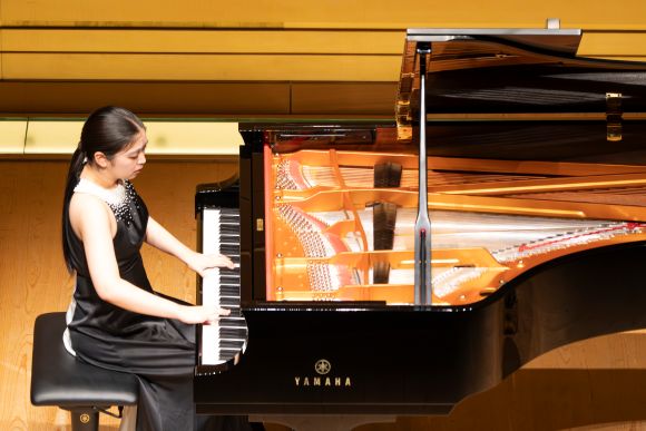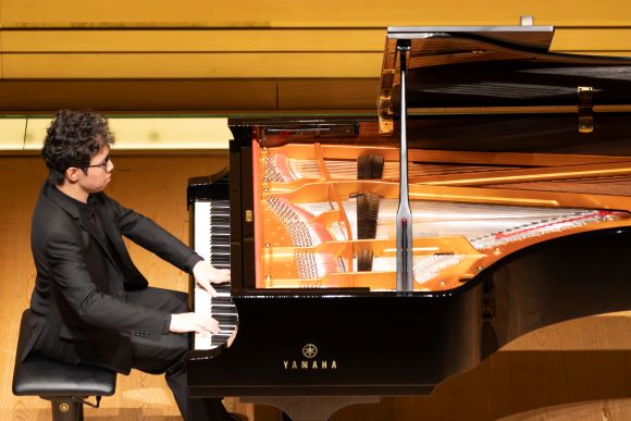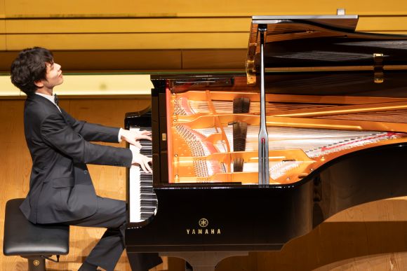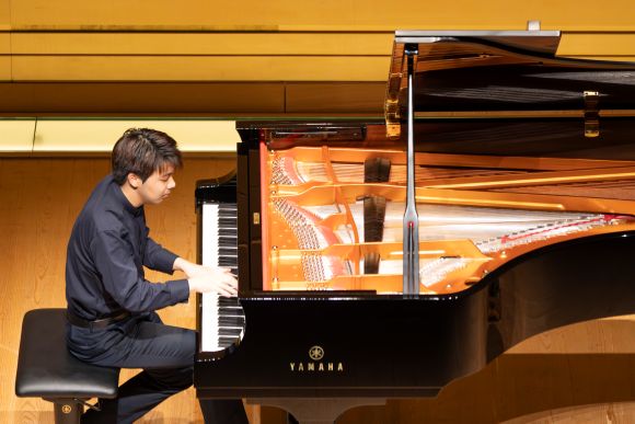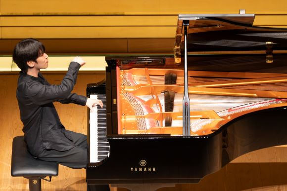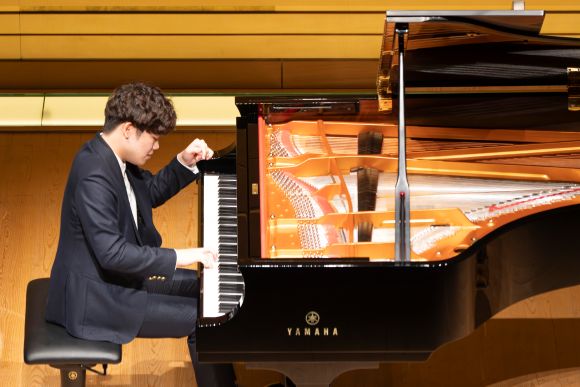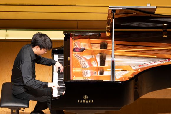 中国出身の李天佑(リ・テンヨウ)さんは、音と音のつながりを大切に紡いだ《ノクターン第18番》を披露しました。軽やかな《ワルツ第5番》は、可憐なパッセージが印象的な演奏で、李さんの個性が際立った舞曲に。また《幻想曲》では、ヤマハCFXのポテンシャルを存分に引き出し、深みのある低音と煌めいた高音で自由に音楽を歌い上げました。幻想的な音色に魅せられた観客から拍手が送られたあと、最後は《英雄ポロネーズ》を堂々と演奏しました。