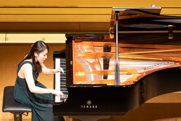 現在パリに留学中の山縣美季さんは、黒と白のコントラストが目を引くスタイリッシュなドレスで登場しました。《ノクターン第18番》を豊潤な音色で紡ぎ、祈りを捧げるかのような静謐な演奏に、客席のあちこちから感嘆のため息がもれます。一方、《ピアノソナタ第3番》は、クリアな音色で決然としたテーマを奏で、唸るような低音や軽やかなスケルツォなど、多彩な表情を披露。山縣さんが描く物語が鮮明に浮かび上がり、聴衆の心に深く届きました。